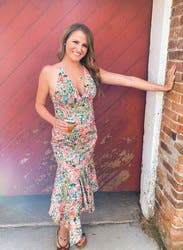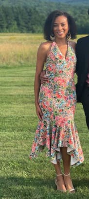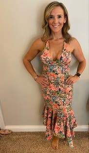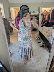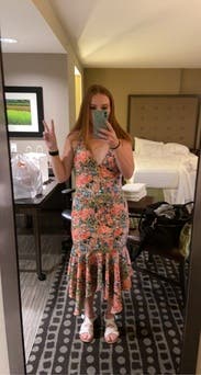 This dress was so fun to wear and I got so many compliments on it! I loved the material, the low back, and the ruffle hem. The only reasons I gave this 4 stars are because the dress accentuated my stomach--which I'm very conscious of--and because the top gave no support for my smaller bust.