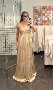 Felt very glamorous trying this on because of the color (think Greek goddess!). I could've possibly sized down if I wanted the bodice to be really fitted and slimming. The R length was good for flats (I'm 5'8") but if you wanted to wear heels, might need a L length.