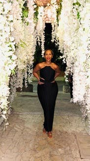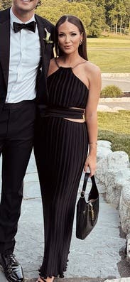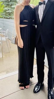Wore this to a wedding that was formal/black tie optional and guests were instructed to wear black and the dress was perfect! The cutouts and chain detail in the back made the dress feel sexy and unique received a ton of compliments. Also the dress is long, it’s at my ankles and I’m in 4” heels. Would love to wear again!
