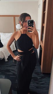 I’m totally obsessed with this dress- from its silky, pleated material, to the bolded gold chains. It’s light material, though not see through at all; I was able to remain comfortable dancing all evening. I got SO many compliments on it! I did use “booby tape”, not that I needed it, but it helped me feel more secure. The dress isn’t terribly long, it hit me ankle-length, and I wore 2 inch heels. I would 💯 rent this dress again.