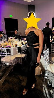 This dress was the perfect fit and cut to accentuate the best parts of a post partum body while hiding my trouble areas. Be forewarned you CAN wear a strapless bra but undies are hit or miss if you're below 5'4. I'm 5'0 and the cut outs hit below my waistline. Sexy for sure and very daring. My partner loved how I looked and I loved how I felt. Jewelry can be very minimal as the gold straps take care of that. 10/1 no notes.