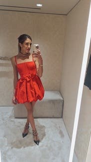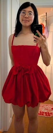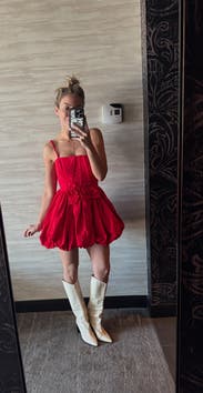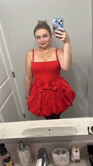 I love this dress! It’s a strong red color. Corset vibes so you get the push up boob effect. Really short! I’m 6’ tall though. Easy to style. Statement piece. It was SO HARD to zip up haha I was practically sewn into it