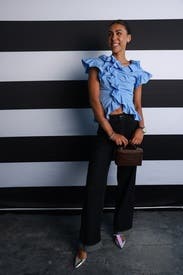 The AKNVAS Penelope Cotton Poplin Top brings playful detailing and polished ease with its ruffled sleeves and ruched bodice. Style it with tailored shorts and platform loafers for a modern classic look.