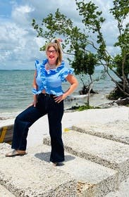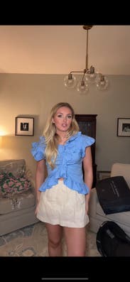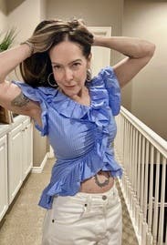 A great top to go with white pants or blue jeans. Feminine with the ruffles too. The front shows the belly button a bit if you are not wearing high waisted pants.