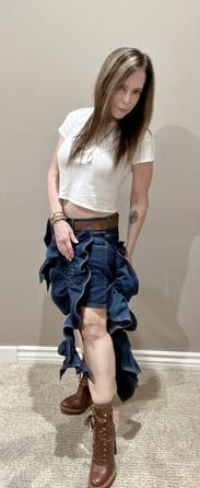 Be prepared to do some heavy lifting when this arrives in your bag! I was seriously wondering if I had received my order as well as someone else’s based on the weight of the bag alone. As far as the fit goes, it was just a little too large. Combined with the heavy weight of the denim ruffles, the skirt kept slipping down too low. I tried belting it, but the waist was just too big. I wore it out anyway and I definitely got some interesting looks at the grocery store. I totally had fun with it, and would rent again in a smaller size for the right occasion.