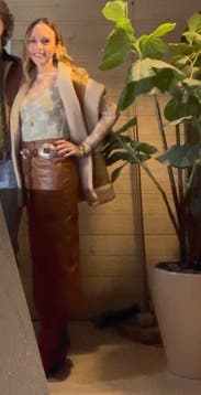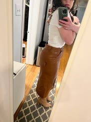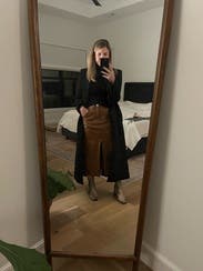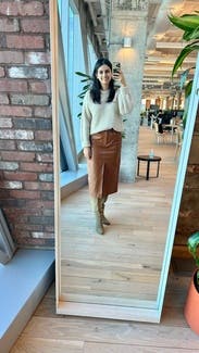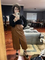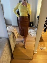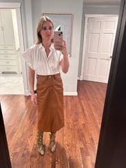from your desk straight to drinks. leather weather extends into spring with this double slit midi skirt. runs a tad large in the waist so size down if you’re in between.
