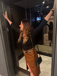 Big booty problems. This outfit was STUNNING from the front. And the skirt is so luxurious and one of those pieces that just elevated any outfit. However my butt was not cooperating inside the skirt. I even tried to lift it up, like you do in your bra, but it was a no go. The waist was loose and I can’t imagine sizing up won’t give me an even bigger waist. 28 waist, 2/4 top, 6/8 bottom