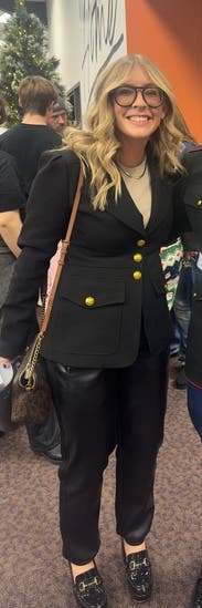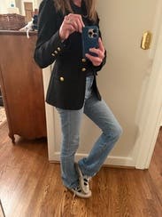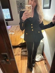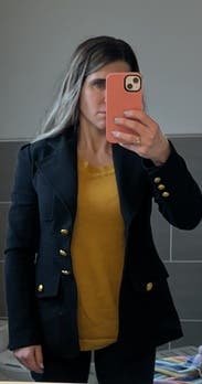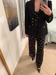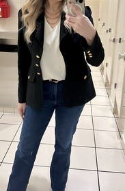 Loved this black blazer with the golden buttons, which are a great touch! My only complaints is how LONG the sleeves were. I had to roll the sleeves so then you couldn't see the beautiful buttons on the sleeves. BUMMER