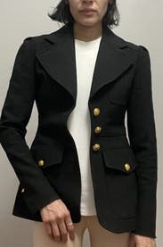 True to size and deep black. Beautiful construction and easy to style with equestrian vibes. Slight stretch to the fabric made it easy to wear. Love the snatched waist-- perfect for an hourglass frame. Paired best with high waisted bottoms. Sleeves were just a touch long for petite frame, but workable. Worn with Khaite Darcy jeans and a Reformation bodysuit for contrast in proportions. Again, with alice + olivia curtain pants and Elyse platform oxfords. Again, with Khaite dark denim and an Anne Fontaine ruffled bodysuit and vintage clogs. This one goes on the buy list.