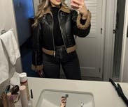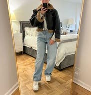 Loved the shearling in this leather jacket to give it a unique look. Runs oversized but that is the look and I loved it!