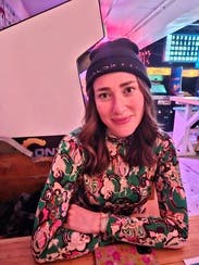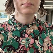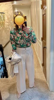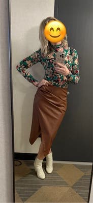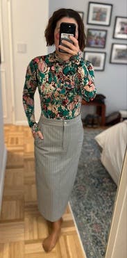 I’ve now rented this twice the last two winters. I wear it with wide wool pants. The pattern is fun and bright, and the fits makes me look buxom. A fun work and after work top!