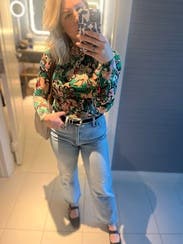 Great top to wear with jeans. Loved the bold colors and print. Can be worn alone or under jackets. Perfect fit and loved the weight of the fabric.
