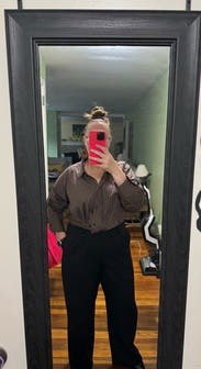 Wore with high waisted pleated work pants. Definitely cropped so just be mindful of that if your work is strict with showing any skin. Very cute and comfy otherwise though.