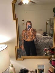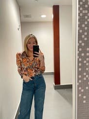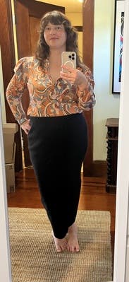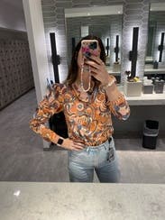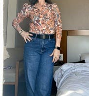 Wore this top for headshots, it’s definitely worth a rent as the pattern was fun and retro and the material felt high end. I am a size 2/4 and rented a 4 and wish I had rented a 6. The arms were snug and the shirt was pulling at the bust when buttoned and I’m an A cup