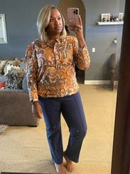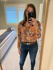 What I really enjoyed about this shirt is the colors. I'm blonde and typically wear cooler tones and avoid orange, but the blue and the maroon really made my blue eyes pop, and you can style it with lots of different colors to pull out those shades even more. It's the perfect orange - vibrant while not being obnoxious. The shirt is also very light weight.