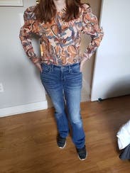 This shirt was just the right amount of pop on a spring work day in New England paired with jeans. Fits true to size. I am usually a 4 or between and 4-6 on top and the small fit well for a tailored look.