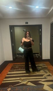 loved this shirt, put it in my “want to buy” category where i wait for price drops and purchase lol. the “neck”line is very sexy and structured so it doesn’t fall down at all, stays perfectly. on the flip side, that means you can’t move your arms like at all. def wouldn’t wear to the clurb, but my main issue was putting on and taking off my jacket, so may be best in warmer weather. will def be renting again for dates if i don’t buy!