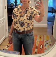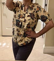 Wore this for Mother's Day. Looked great with cropped jeans. Tight in the arms but otherwise true-to-size. Fun pattern and nice material.