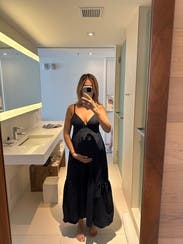 Wore this on vacation at 8 months pregnant and loved it! The top is definitely open so boobs will be out. The size 6 fit great and it has adjustable straps