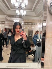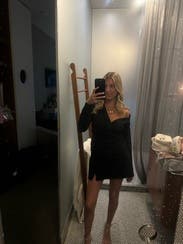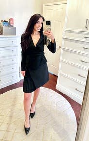 I wore this for dinner with friends. It’s fitted but true to size. It buttons on the inside and wraps around. It’s heavyweight material and not super easy to move your left arm, so avoid this if you’re dancing! Very chic though, so it’s worth it