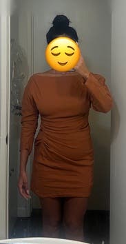 I love this dress. I could have sized down for a better fit but I am hard to fit lol. It’s got a little stretch and all the ruching hides your flaws. Very comfortable but I am going to try a 10. 4’11, 160