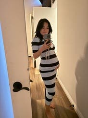 I'm about 30 weeks and this fit like a charm. Super stretchy but flattering! The neck was a little low, but nothing a safety pin couldn't fix.