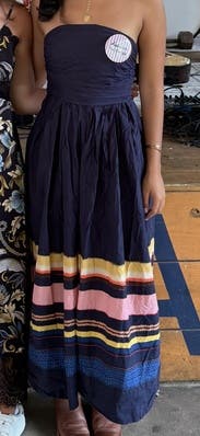 I hesitated to rent this as there were several reviews describing it as having an awkward fit, but didn’t feel that this was an issue for me. The boning and elastic on top was comfortable and the A line skirt on the bottom was flattering. For once I didn’t feel a strapless dress needed to be pulled up all the time. This dress checks all the boxes for me; color (I love navy), contrasting stripes, comfortable fabric (cotton) and POCKETS! I wore this to a slightly dressy outdoor bbq. ALC is a favorite brand of mine, too. I wish I hadn’t had to wait until the end of the summer for it to become available, as I would definitely have enjoyed wearing it more. Would 100% rent again.