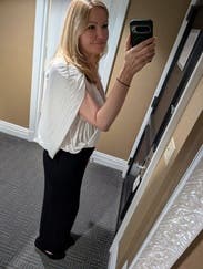 This shirt cannot do anything wrong. Looks cute with jeans, dress pants, trousers, and shorts. Can be styled up or down. I regret not buying this!