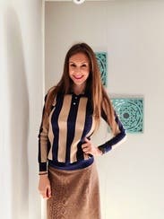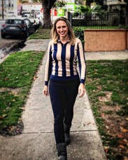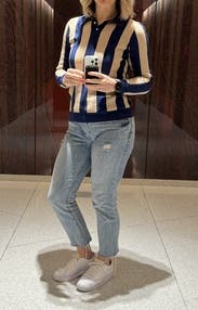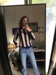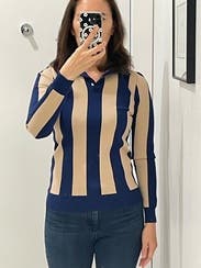 Love the material, flattering fit, cool mod stripes. The jewel button was a sneaky surprise but don’t hate it. Lots of looks and compliments, you’re not going to see anyone else wearing anything like it.