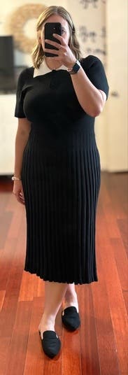 The Alexia Admor Black Collared Knit Dress offers a polished, retro-inspired silhouette with a collared neckline, front button placket, and pleated skirt. Pair it with sleek heels for a refined look.