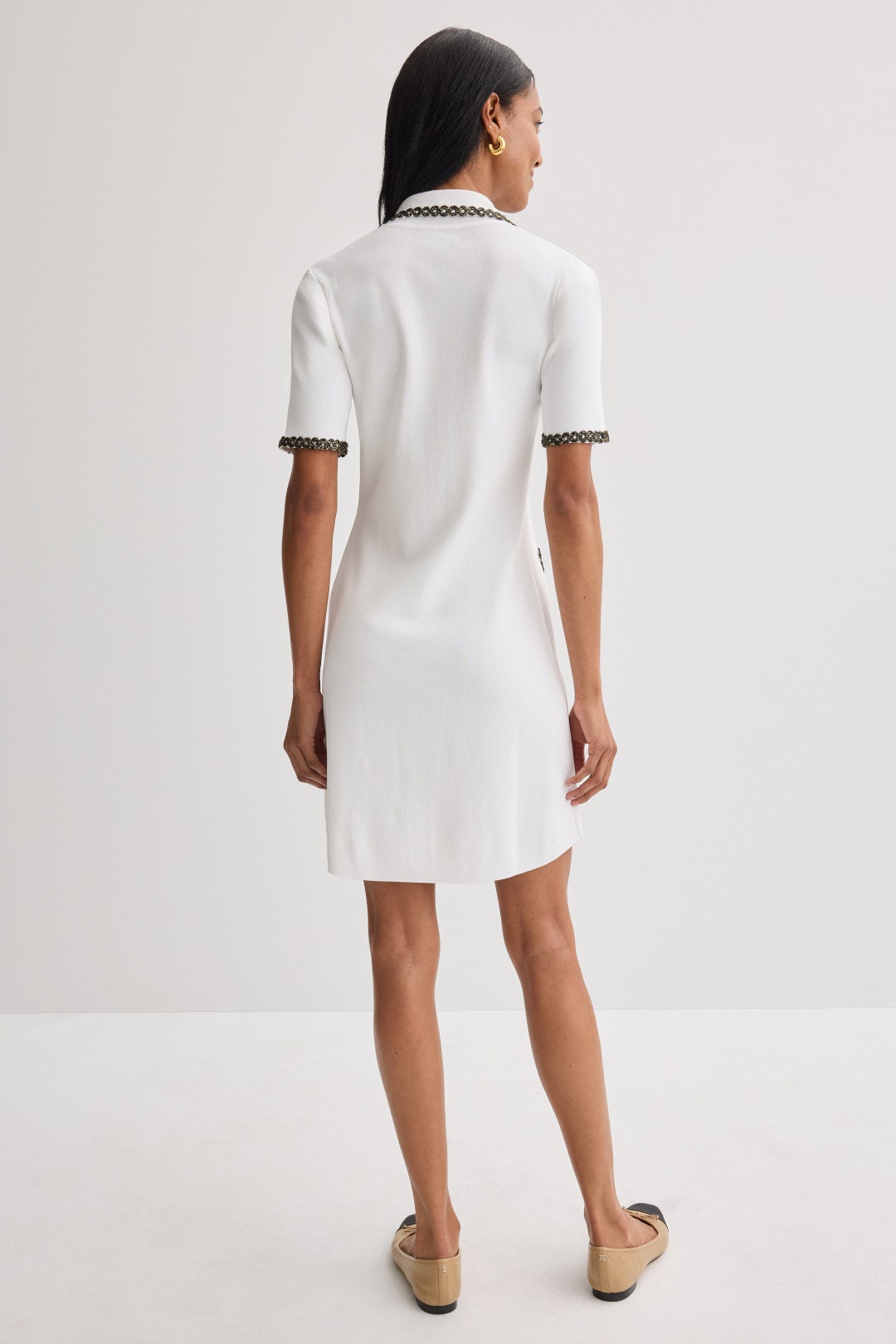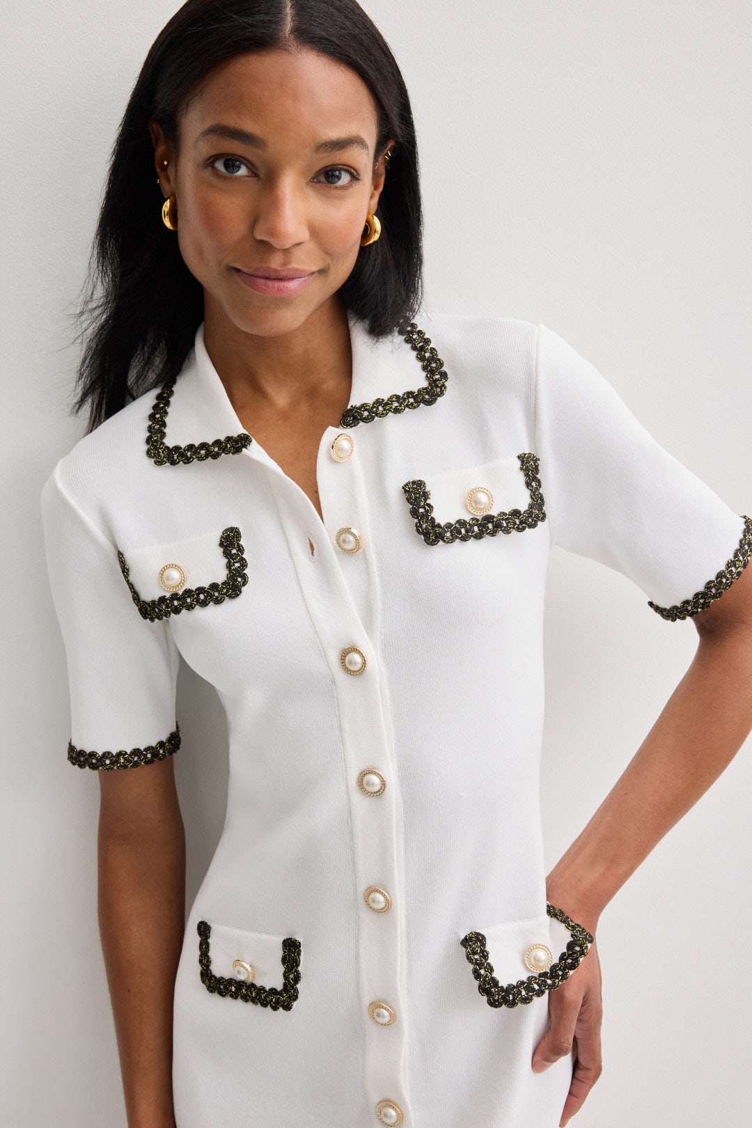 The Odette Button Down Mini Dress by Alexia Admor offers a polished silhouette with its contrast trim and pearly buttons. Style it with ballet flats and a structured tote for a refined daytime ensemble.