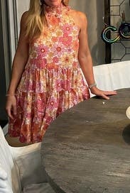 Many compliments on this dress which can be styled up or down depending on the occasion. Probably will buy when it goes on sale. I'm 160# at 5'4" and a 10 fit perfectly! Must wear a halter top bra so that the straps don't show. I took off one star for the design...I didn't really like the drop waist. I would've preferred the pleating to begin at the chest, but then it would probably look like a maternity dress. Will rent again...
