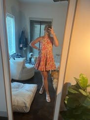 Super cute, very flowy and comfy dress. The colors and pattern are gorgeous. Very groovy. It’s pretty short, but that’s showbiz sometimes. Def recommend!