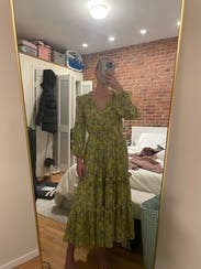 Wore this beauty to a Christmas party in Texas. The color is really pretty and it’s super comfortable and easy to wear. I rented a large but could have definitely sized down.