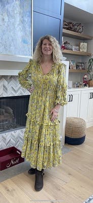 Love this dress; casual or dressy, true to size, the yellow isn’t TOO yellow. Lightweight.