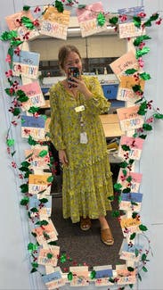 Flowy, flattering, fun. Got endless compliments. Wore for thanksgiving— pre meal I tied the waist for a more defined look, post meal I let it go and it was just as cute and perfectly shapeless. Colors are vibrant and neckline is adorable