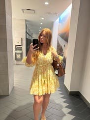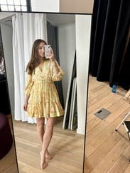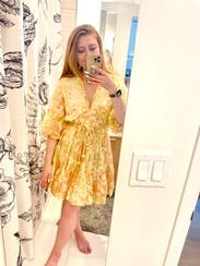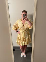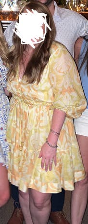 Obsessed, will rent again. Make sure to size down, I honestly was swimming in the small but made it work. Fabric is flowy and doesn’t wrinkle, tons of compliments on the color! The belt tie with the yellow balls is so fun and playful, really made the dress look elevated.