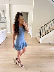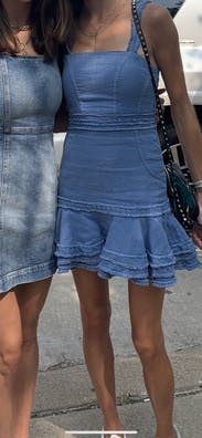 I'm a sucker for a denim dress and this one is so flattering! I originally ordered the medium and it didn't quite fit, I'm a 6/8 and the large fit well. Thicker material and the ruffles at the bottom were so cute! Thinking about buying this one!