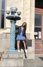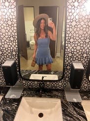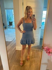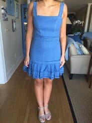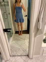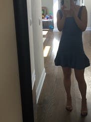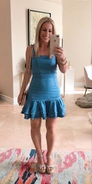 Loved wearing this dress around New Orleans! It was a little chilly, so I paired with a leather jacket. Really great dress with a fun bounce. The straps were a tad big but I did not need to pin them down.