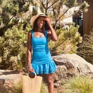I rented this to wear on a summer weekend in the Hamptons. Style is cute and flirty. Mostly flattering, but I felt like maybe the ruffles made my body look too straight by comparison Fabric is unique but I didn't love it. Almost denim like but with thicker threads. It's tough to describe! I'm usually a 2 or a 4 depending on the brand. The Small was just snug enough that I didn't need a bra. Stretched out slightly over the course of the day