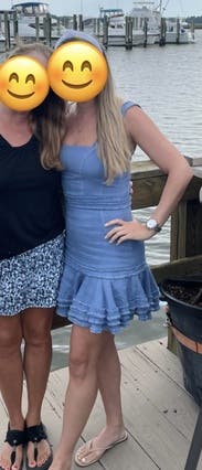 I really loved this dress. I'm a true 4, 135 lbs and rented a medium. Alexis tends to run small and I have found that mediums are more comfortable than my usual small. The straps were subsequently a bit large, but the denim is so soft and comfortable I didn't mind. Super flattering and feminine shape, I would absolutely recommend renting. This can be dressed up or down, as I did with TKEES flip flops.