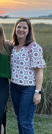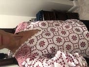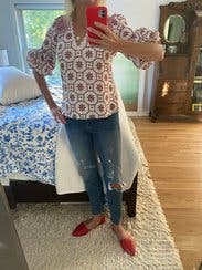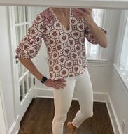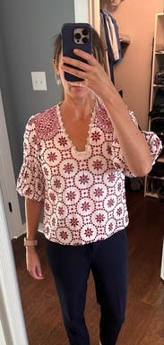 This is a beautiful linen eyelet. The colors (cream and ruby) are so pretty and the fabric is so eye-catching. I got compliments on this, work to work on casual Friday. Wore this again over the weekend with white denim shorts and without a cami underneath - so airy and comfortable. This was brand new so the linen was a bit stiff (as expected), but the quality is gorgeous and I love the look. This is a little bit big for me, but still fine; I'm usually a 0 on top. Highly recommend!