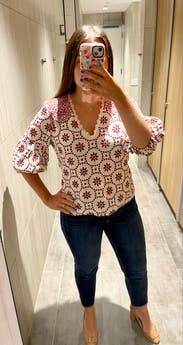 Loved this top, comfortable fit. Pretty embroidery and puffy sleeves!