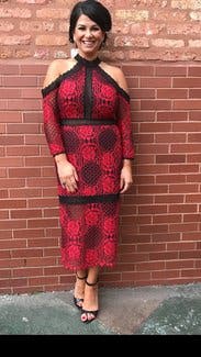This dress is absolutely gorgeous! It's the perfect mix of classy and sexy. I love the open shoulders and it's beautifully fitted, the lace covers enough where it still looks appropriate.