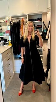 Wore this to a big evening party and got several compliments. The bodice is slightly fitted which I loved - gave me a waist with the slight flat of the a-line. Definitely wants to be worn with heels, not flats!