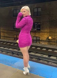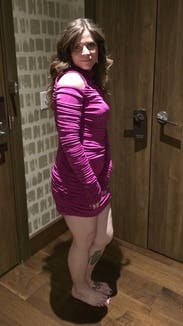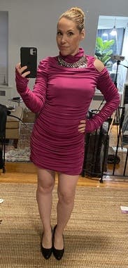 Loved this dress! The material and construction is excellent, the color pink is rich and super flattering. It looks velvety in photos but that is just from the shimmer of the lycra-like material. The “glove” sleeves were so fun and sexy. I wore this on a cool fall evening but was not too cold at all. The turtleneck + the gathered material kept me comfortable. It took some play to find the right way to style it around my chest, I opted for no bra which worked well with the way the material lays around the boobies. It looked far more flattering without the added volume from a bra.
