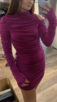Loved this dress - the color, the high neck, the thumbholes (!), the full body ruching, the shoulder cut out!! So fun and flirty, stretchy and flattering. I have an hourglass shape and I think this will work for most body types due to the fabric. However, if you are very TALL it may not be for you. I’m 5’6” and the hem just cupped my cheeks! It’s a super mini dress, but it still feels elegant thanks to the design. Will rent again.