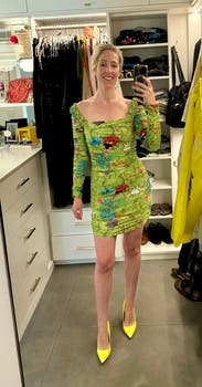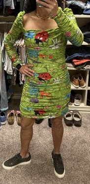 This dress has a LOT going on, but it’s so fun and unique — and why not? That’s why we rent, right? Ladybugs and cherries, my kiddos loved it too. The length of more modest than mini, but it was a little bit on the short side for work, for me. Fun cocktail dress… and if you had a garden or “bug” theme? Perfection!