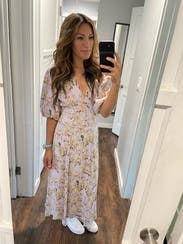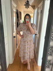 with a 34A chest, I normally can’t wear styles like this- they gape or look so obviously not filled out, so this dress was the BEST surprise. this was a very fun rental- wore to two weddings and a baby shower. I typically go for simple designs & solid colors, this was the perfect foray into something floral & feminine!