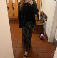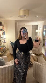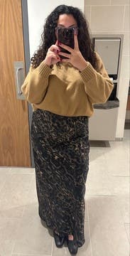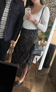 I wear the skirt to work with sneakers and absolutely loved it! I’m definitely gonna wear this on the weekend and dress it up. The slit is great and not too high. I would say the skirt runs slightly big since the waist is elastic. I did feel comfortable in my true size so I probably wouldn’t size down.